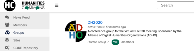 1. Select DH2020 Group. To view or respond to a presentation, select the DH2020 group and click the “Discussion” tab.This image instructs users to select the "Discussion" tab on the DH2020 Humanities Commons homepage