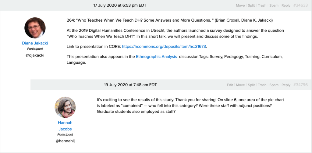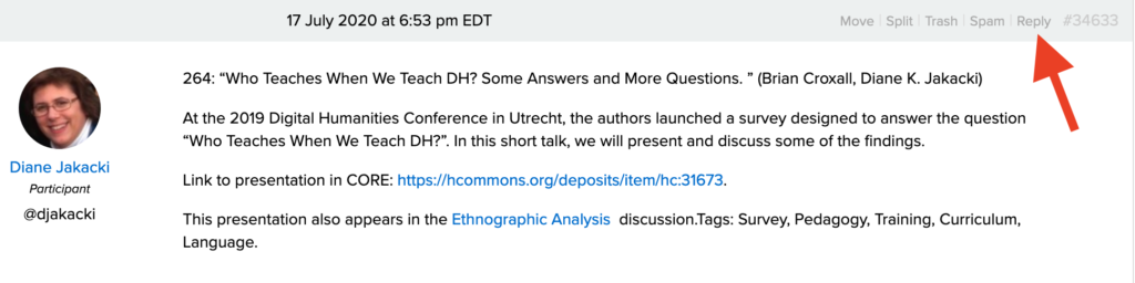 3. Open the topic discussion. Once you have found a topic/discussion by scrolling or using the search bar, select the link to open the discussion page. Each presentation will have its own reply to the top “Accepted Presentations” post where you will find a link to follow and/or a file to download.This image instructs users to select a specific topic within the "Discussion:" tab of the DH2020 Humanities Commons page